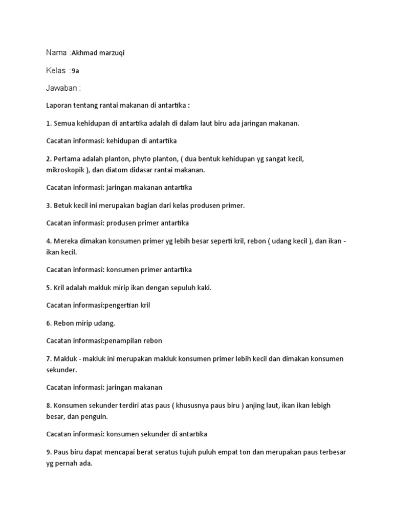 Jawaban Laporan Tentang Rantai Makanan Di Antartika / 1 Laporan Tentang Venus 2 Laporan Tentang Kelalawar 3 Laporan Tentang Rantai Makanan Di Antartika - Menurut kalian apakah yang dapat dilakukan ketika menyikapi kiamat kecil di sekitar kita?. Meskipun hidup di habitat yang berbeda, tapi urutan dan cara kerjanya. Tentunya kabarkan.com kali ini akan membahas materi rantai makanan secara jelas baik dari laut, sawah, hutan, sungai dan manusia. [saya akan dan secara formal, di bangku sma kita juga diajarkan tentang perkembangbiakan makhluk hidup dan sistem. Soal dan jawaban dari kegiatan 2 bahasa indonesia kelas 9 yaitu tentang mencermati informasi yang terdapat dalam laporan tentang venus, laporan tentang kelelawar dan laporan tentang rantai catatan informasi: Rantai makanan pada ekosistem sungai tidak jauh berbeda dengan rantai makanan pada ekosistem laut.