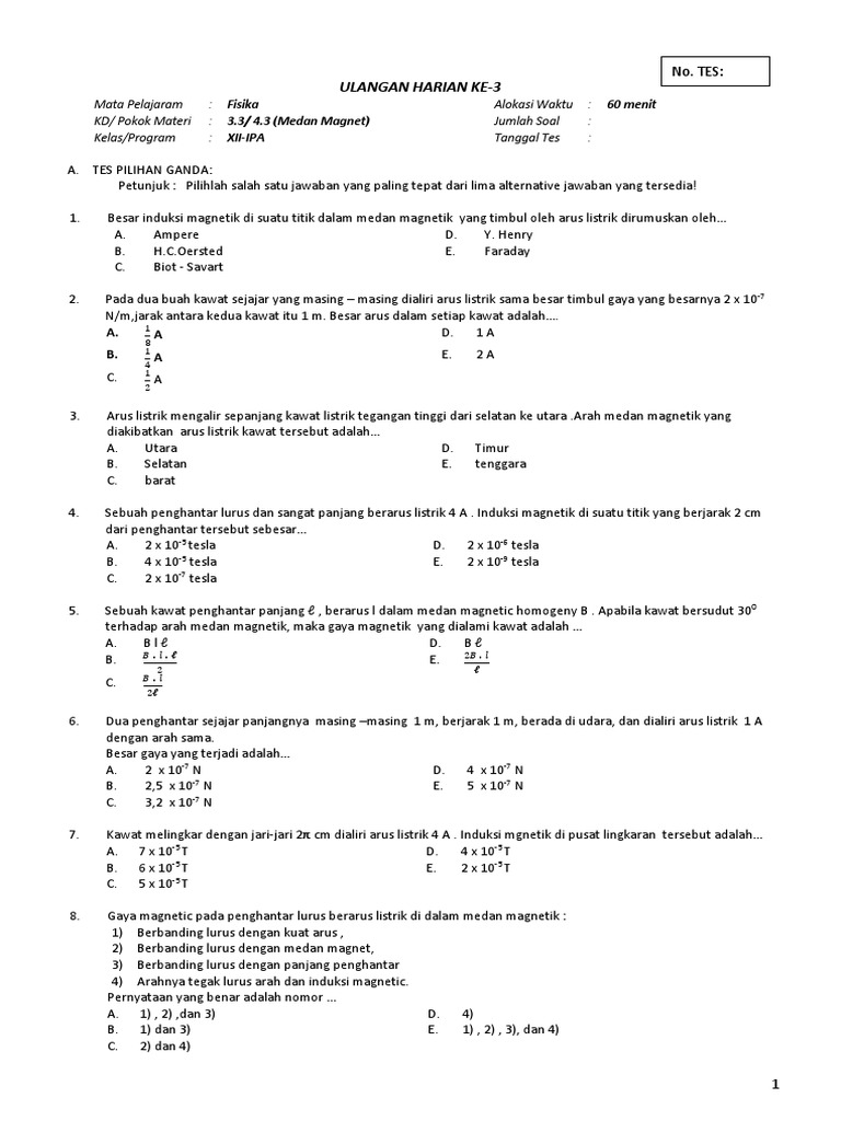 Soal Pilihan Ganda Medan Magnet Kelas 12 - 30 Soal Medan Magnet Pilihan Ganda Dan Jawaban : Pembahasan soal membuat magnet un fisika smp contoh soal dan jawab fisika tentang medan magnetbidang kumparan dan arah medan menghasilkan sudut 30 0.. Rumus kuat medan magnet induksi magnetik b b berbanding lurus oleh permeabilitas μ kuat arus i dan jarak a 2. Kunci jawaban dan pembahasan soal ipa tentang gaya magnet ini dapat anda lihat pada akhir artikel. March 18, 2018 at 12:10 am delete untuk refrensi tambahan tentang fluida, soal jawab medan magnet silahkan kunjungi: Konsep mudah medan magnet pada kawat lurus ,kawat melingkar … Sep 18, 2020 · medan magnet merupakan salah satu materi fisika yang dipelajari di kelas 12 semester 1, oleh karena itu disini saya mencoba untuk membuat latihan soal materi medan magnet beserta pembahasannya secara terperinci, bisa dijadikan latihan untuk para siswa agar lebih memahami materi medan magnet atau referensi oleh guru dalam membuat soal ulangan.